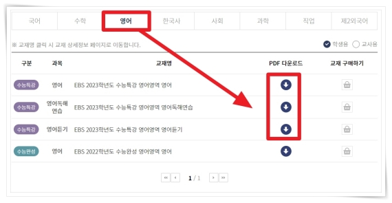 그런데 간혹 수능특강의 정답과 해설 부분을 분실하는 경우가 있죠. 이럴 때는 걱정하지 말고 공식 자료실에서 책자에 같은 내용의 PDF 파일을 다운받을 수 있습니다.