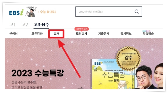 1. EBS 홈페이지 상단 메뉴에서 "교재"를 클릭해 주세요.