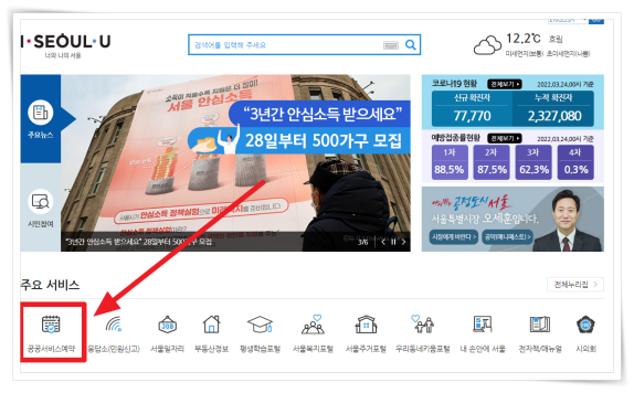 1. 홈페이지 하단 주요 서비스에서 "공공서비스 예약"을 클릭해 주세요.