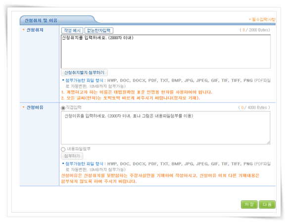 7. 신청 취지 및 사유를 정확히 입력 후 저장하면 접수하실 수 있습니다.