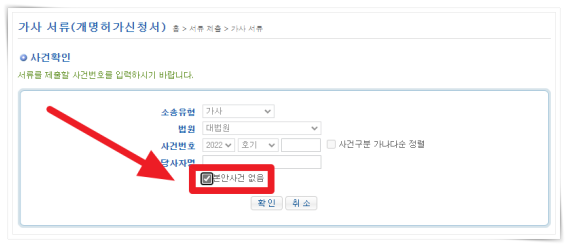 5. 로그인 후 사건확인에서 "본인사건 없음"을 클릭해 주세요.