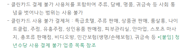 청년수당 S20체크카드에는 클린카드 기능이 적용되어 아래 제한 업종에서는 카드 결제가 불가합니다.