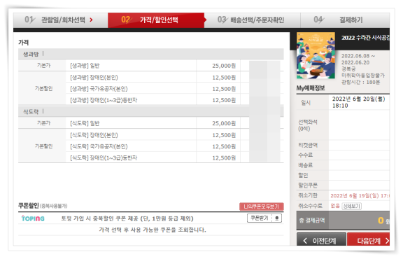 4. 가격 및 할인정보 입력 후 결제를 진행하면 예매를 완료하실 수 있습니다.