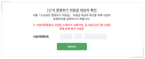 2. 지원금 대상자 확이늘 위해 사업자등록번호를 입력해 주세요. 현재 운영 중인 사업장이고 서울시 소재여야 합니다.