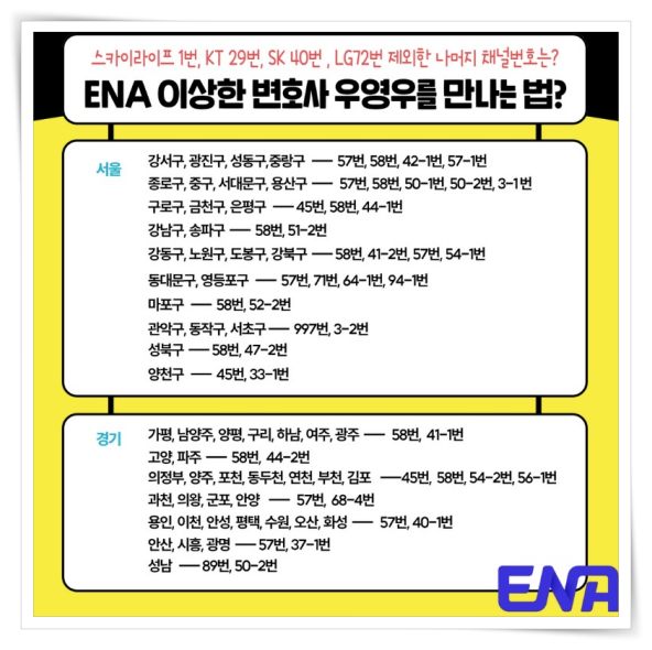 우영우를 실시간으로 볼 수 있는 채널을 ENA에서 최근 공개했습니다. 해당 지역의 번호를 확인 후 시청하시면 되세요. 모바일이나 태블릿으로 시청하려면 하단 내용을 참고해 주세요.