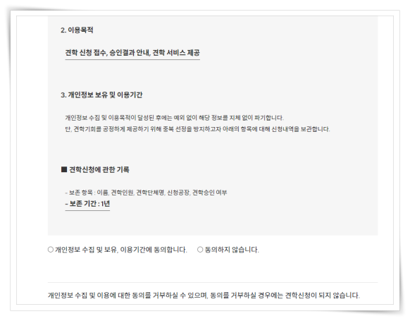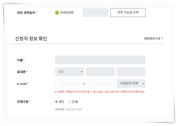 7. 마지막으로 등록을 클릭하면 견학 여부를 문자 또는 메일로 받으실 수 있습니다.
