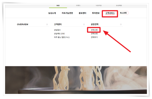 1. 홈페이지 상단 메뉴 "고객서비스"에서 "견학신청"을 클릭해 주세요.