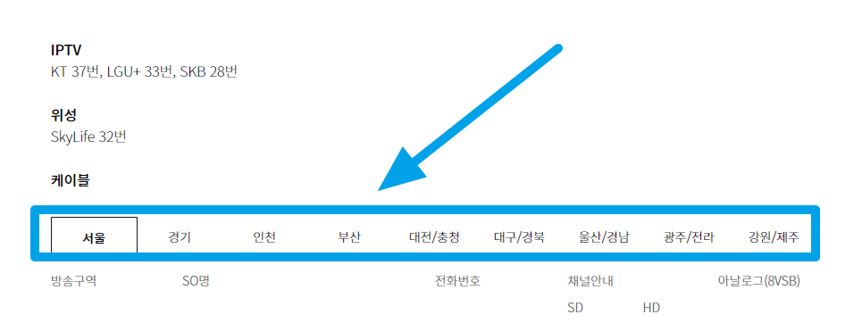 3. 그러면 지역별 채널 안내를 확인해 보실 수 있습니다.