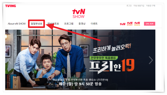 1. tvN show 홈페이지 상단 "일일편성표"를 클릭해 주세요.