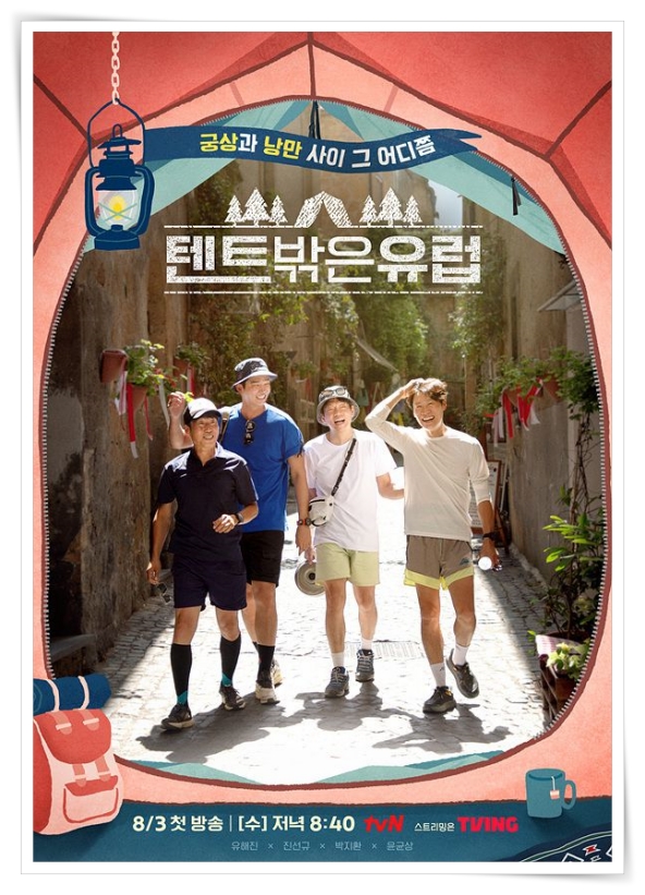 그러다 우연히 tvN `텐트 밖은 유럽` 방송을 시청하게 되었습니다. 배우 유해진, 진선규, 박지환, 윤균상이 캠핑을 하며 자유롭게 유럽을 여행하는 내용입니다. 유럽을 배경으로 담긴 모습이 보는 내내 부러움과 설렘을 느끼며, 언젠가는 나도 갈 수 있지라는 희망적인 마음으로 보고 있어요. 방송은 매주 수요일 저녁 8시 40분에 시작하고 재방송은 현재 tvN show 채널에서 가장 많이 볼 수 있습니다.