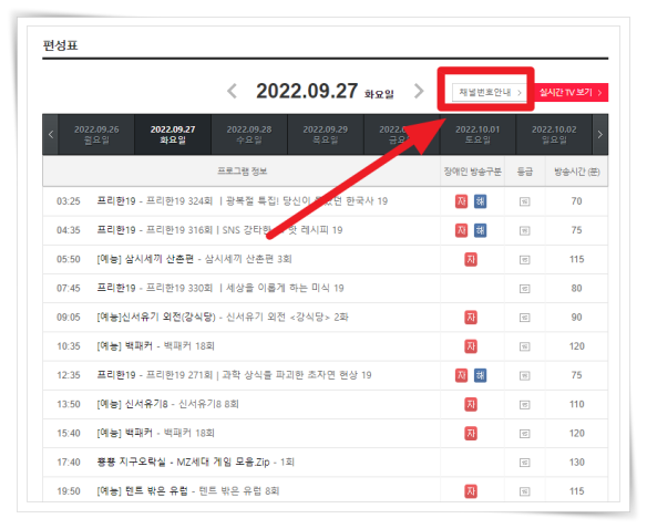 2. 그러면 재방송 일일 방송 시간을 확인할 수 있으세요. 채널번호가 궁금하다면 우측 "안내"를 클릭해 주세요.