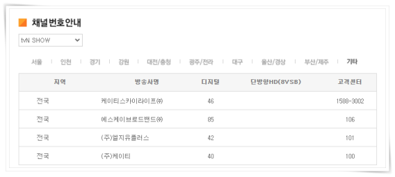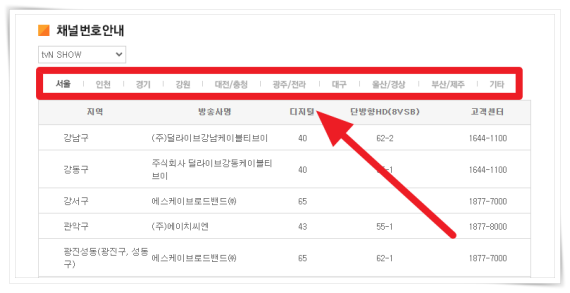 3. 상단 지역을 클릭하면 지역별 방송사 번호를 보실 수 있어요.