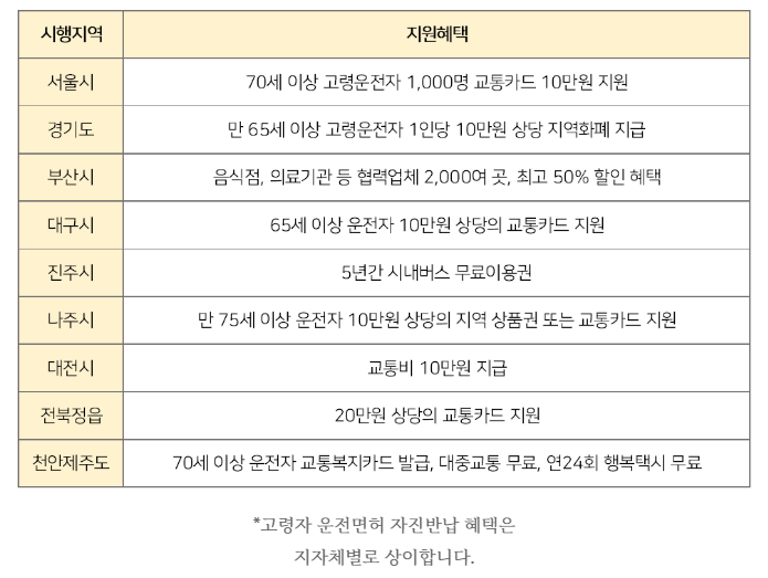 고령자 운전면허 반납 방법을 알아보기 전에 혜택을 먼저 말씀드릴게요. 최근 편리성 때문에 갈수록 늦어지는 면허증 반납 상황을 개선하고자 많은 지자체가 인센티브 제도를 시행하고 있습니다. 1회 10만 원을 지원하거나 지역화폐, 상품권으로 지원하기도 하는데, 전라도 일부에선 20만 원 지역상품권을 제공해서 눈길을 끕니다. 그리고 부산시는 음식점, 의료기관 등 협력업체 2000여곳에서 최고 50%의 할인 혜택을 받을 수 있다고 해요.