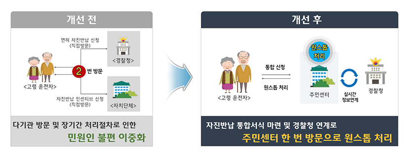 개선된 신청방법은 자진반납 통합서식 마련 및 경찰청 연계로 원스톱으로 하실 수 있습니다. 운전면허증 지참하여 거주지 주민센터 방문하시면 통합 신청 및 혜택을 바로 받으실 수 있습니다.
