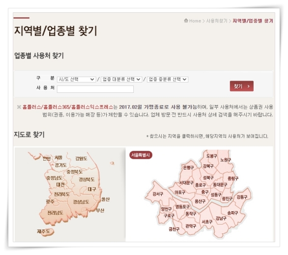 정확한 사용처는 공식 홈페이지 조회를 통해 쉽게 알아볼 수 있는데요. 지역별, 업종별 찾기를 통해 주소, 연락처, 사용범위를 확인할 수 있습니다.